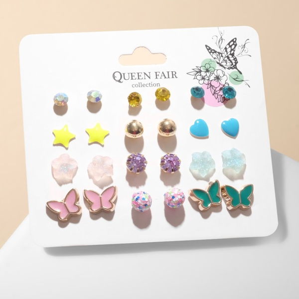 Набор серьги 12 пар "Принцесса" бабочки, цветные, цвет золотистый