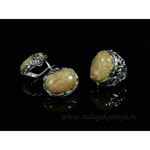 Серьги из унакита, филигрань, ручная работа, камень овал 18х13мм, швензы посеребрение
