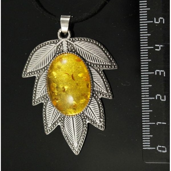 Кулон из янтаря желтого (иск.) "лист", цвет ант. серебро, овал 25х18мм