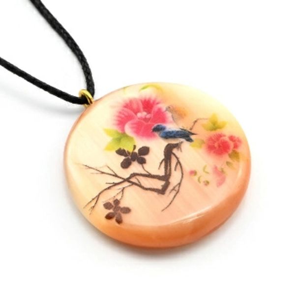 • Кулон на шнурке из селенита Птичка на ветке круг 40мм