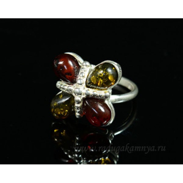 Кольцо с янтарём в посеребрении 4 капельки 16мм коньячный, зеленый (иск.)