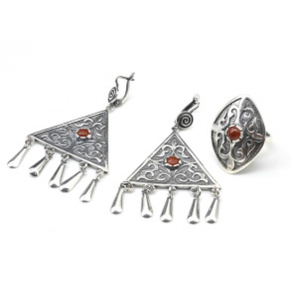 Кольцо и серьги с авантюрином красным имитация..