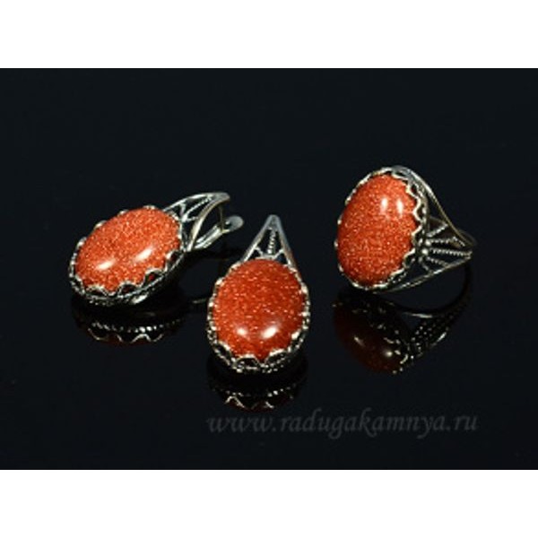 Кольцо и серьги с авантюрином красным имитация..