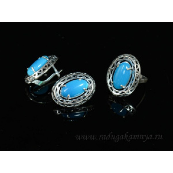 Кольцо и серьги с агатом тонированным, цвет голубой