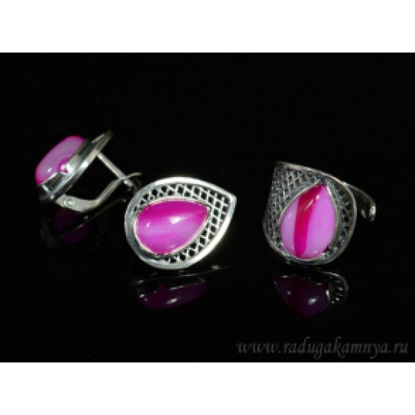 Кольцо и серьги с агатом тонированным, цвет фуксия.