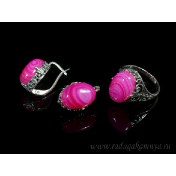 • Кольцо и серьги с агатом тонированным, цвет фуксия