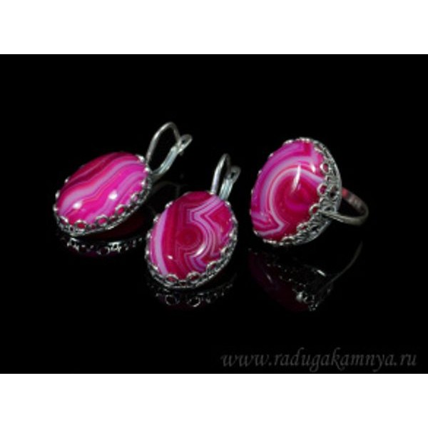 • Кольцо и серьги с агатом тонированным, цвет  фуксия