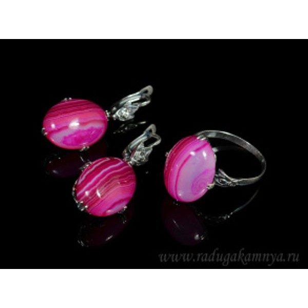 • Кольцо и серьги с агатом тонированным, цвет  фуксия