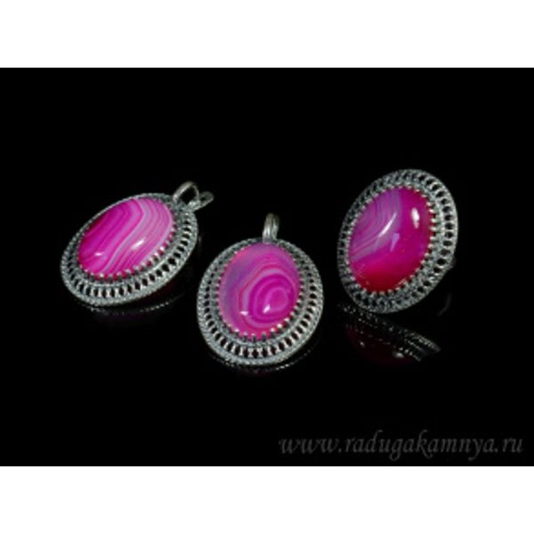 Кольцо и серьги с агатом тонированным, цвет фуксия