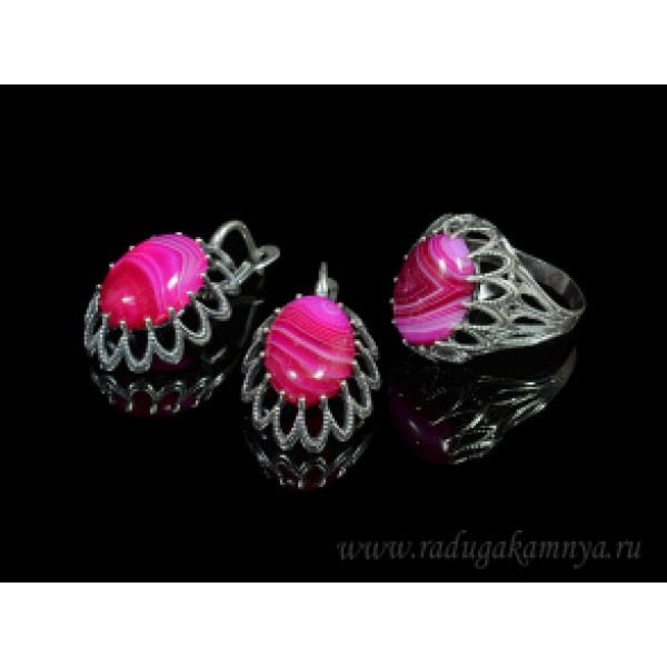 Кольцо и серьги с агатом тонированным, цвет фуксия