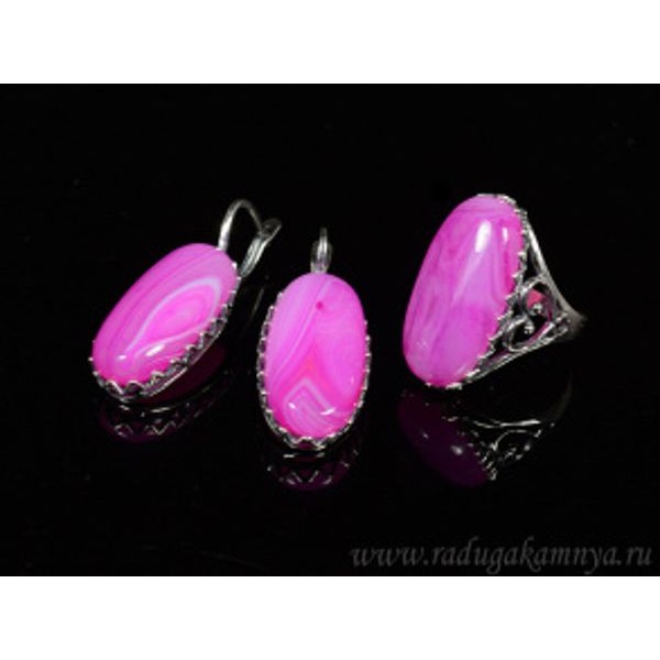 Кольцо и серьги с агатом тонированным, цвет фуксия