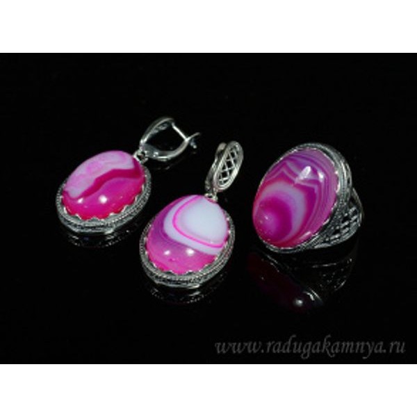 Кольцо и серьги с агатом тонированным, цвет фуксия