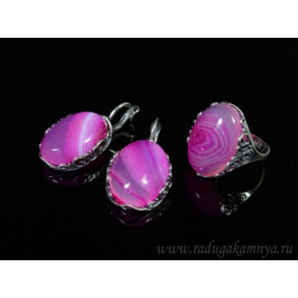 Кольцо и серьги с агатом тонированным, цвет фуксия
