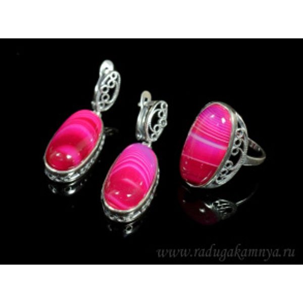 Кольцо и серьги с агатом тонированным, цвет фуксия