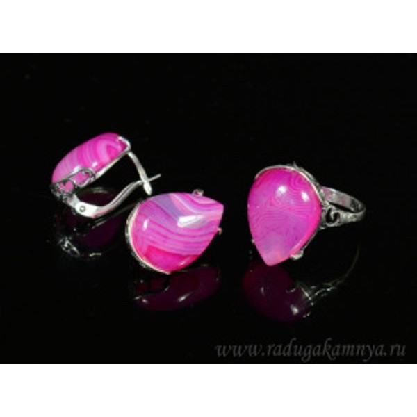 Кольцо и серьги с агатом тонированным, цвет фуксия