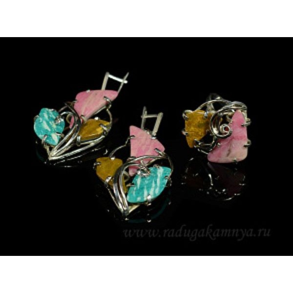 • Кольцо и серьги из родонита, амазонита и яшмы