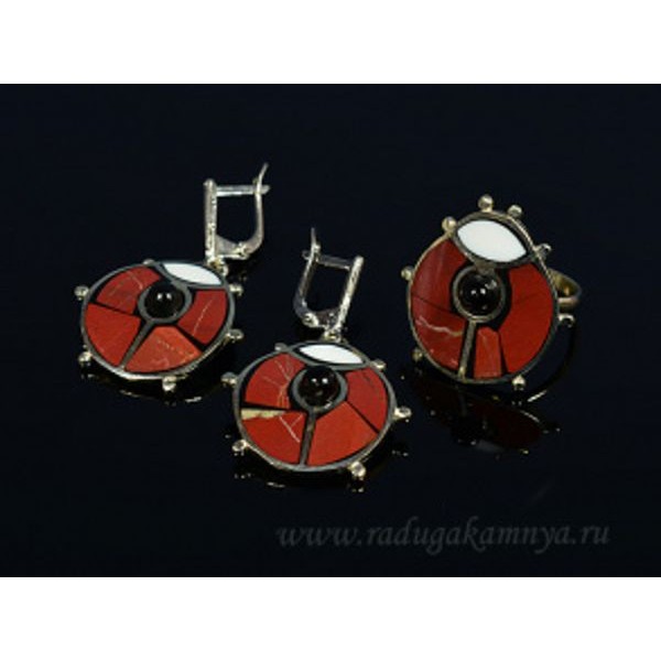Кольцо и серьги "Божья коровка" яшма и кахолонг 26*25мм.