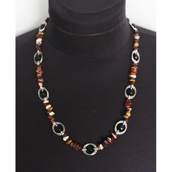 Колье из яшмы вишнево-желтой (галтовка) и агата чёрного (шарик в рамке)