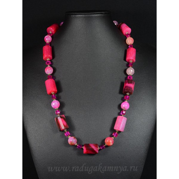 Колье из агата пати тонированного цилиндр с гранями 14*20мм шарик 10мм фуксия, 55см