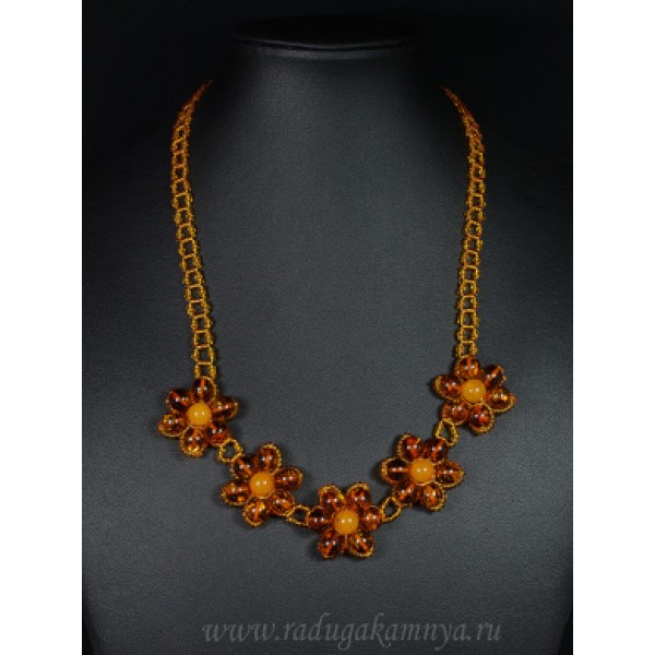 • Колье с янтарем и бисером "5 цветочков" карамельный, коньячный, 50см