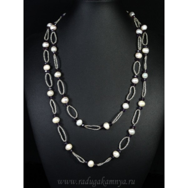 Бусы 115-120см из жемчуга шарик 8-9мм белый с бисером и цирконом сиреневым