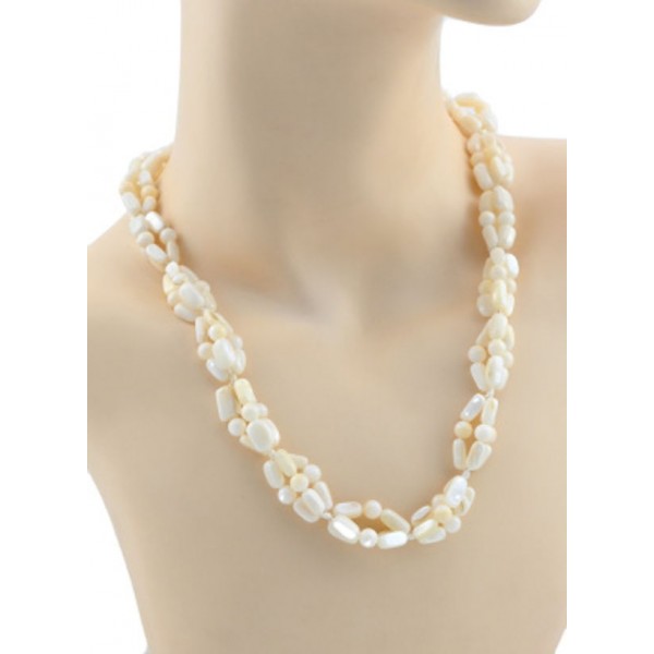 Бусы тройное плетение из перламутра галтовка через шараик белая, 51см.