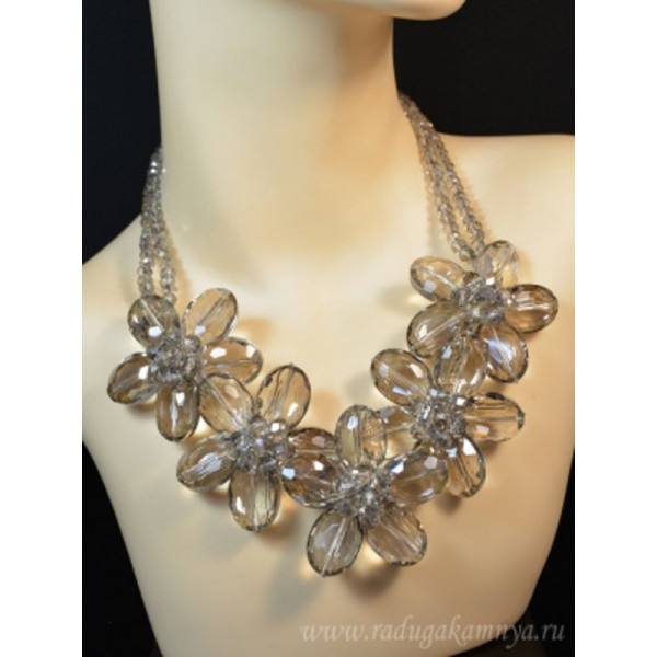 Колье с цирконами 2 нити 5 цветков 55мм цвет раухтопаз, 50см