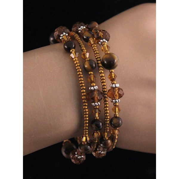 Браслет из тигрового глаза и коричневого хрусталя, шарик 9-10мм, на струнке, 2-3 оборота