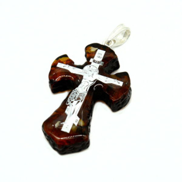Кулон из янтаря крестик 28*42мм коньячный, гальваника цвет серебро (иск.)