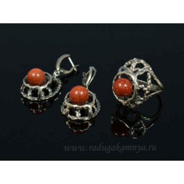Кольцо и серьги с авантюрином красным имитация..