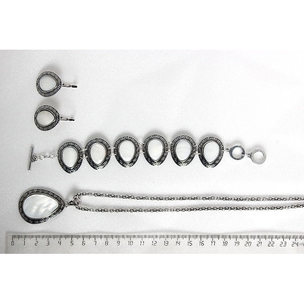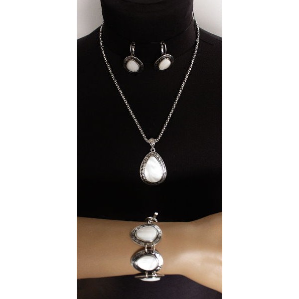 Комплект: колье, браслет и серьги из перламутра (белый), капля в металле с узором