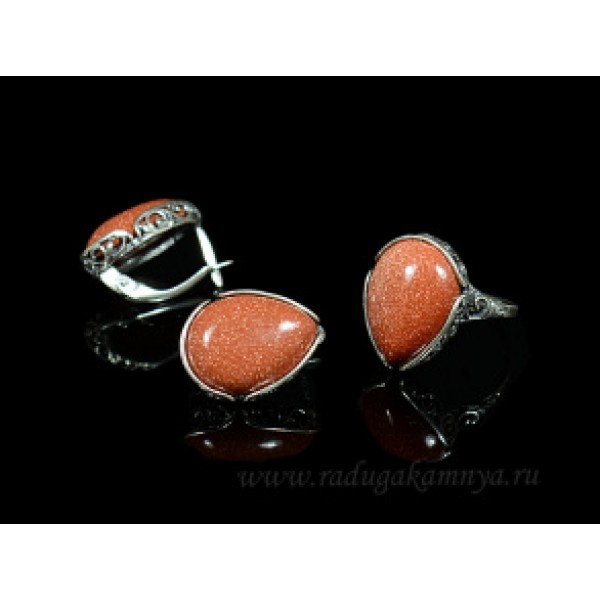Кольцо и серьги с авантюрином красным имитация..