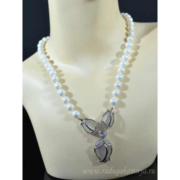 • Бусы из майорки белой, Кулон "3 бутона" из кошачьего глаза (синт.) цвет белый, 48см