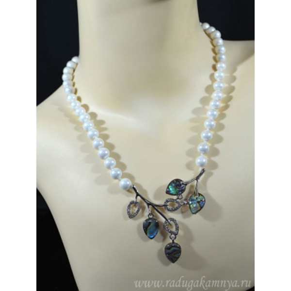 • Бусы из майорки белой, Кулон "Веточка" из перламутра гелиотис, 48см