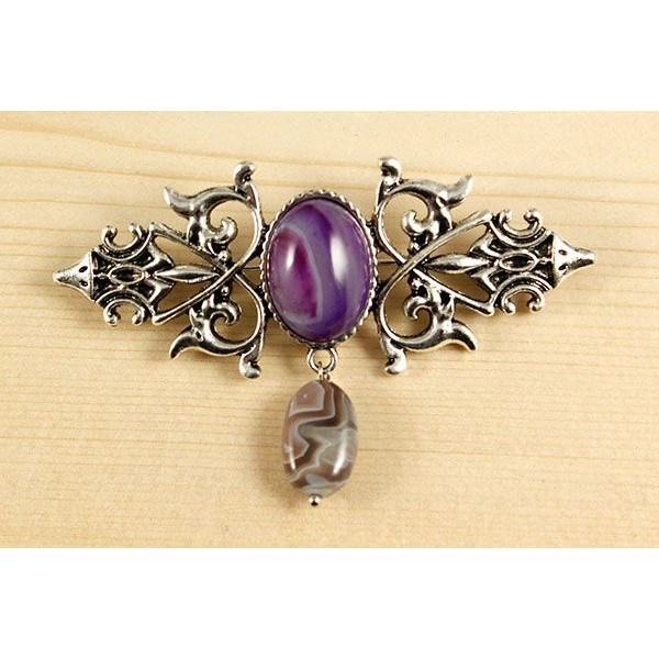 • Брошь из агата фиолетового (тонир.) "вензель", основа 70х2.4мм, овал 18х13мм, подвеска агат серый