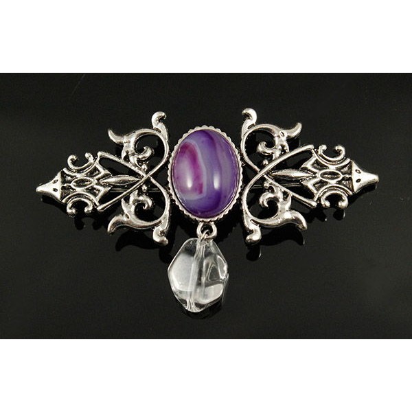 • Брошь из агата фиолетового (тонир.) "вензель", основа 70х2.4мм, овал 18х13мм, подвеска горный хрусталь