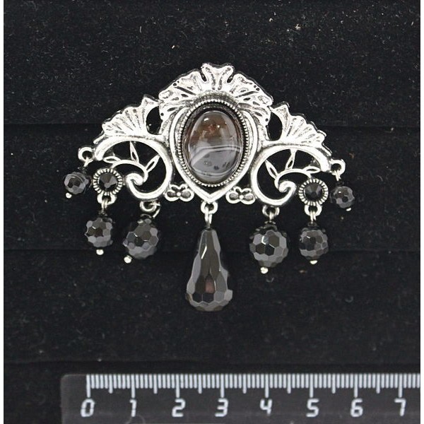 Брошь из агата черного "трюмо", овал 18х13мм, со стразами и подвесками из черного агата
