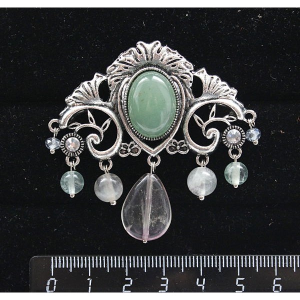 Брошь из флюорита "трюмо", овал 18х13мм, со стразами и подвесками из флюорита