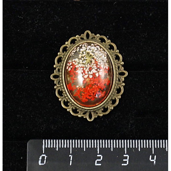 Брошь c кабошоном из пластика "два цветка", цвет красный, овал 25х18мм, оправа с узором цвет бронза