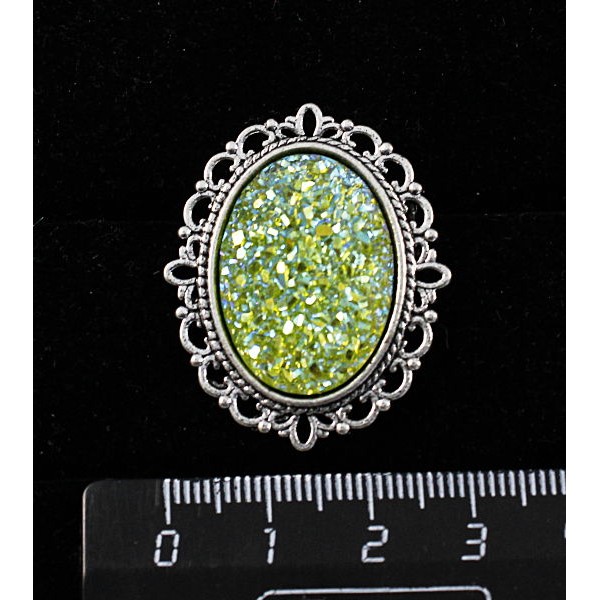 Брошь c кабошоном из пластика "щетка кристаллов", цвет салатовый, с ажурным контуром, цвет ант. серебро, овал 25х18мм