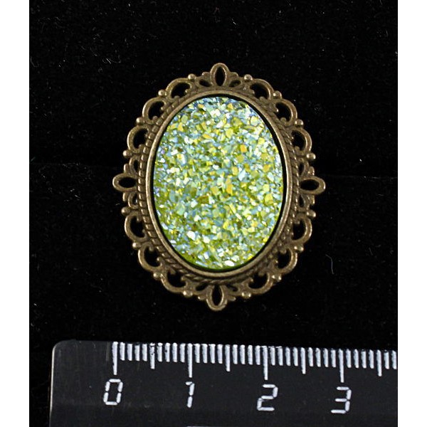 Брошь c кабошоном из пластика "щетка кристаллов", цвет салатовый, овал 25х18мм, с узором цвет бронза