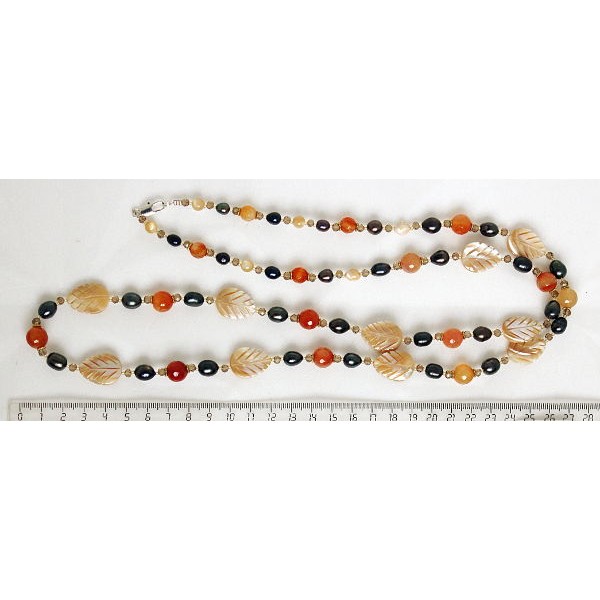 Бусы длинные из перламутра, сердолика и жемчуга черного