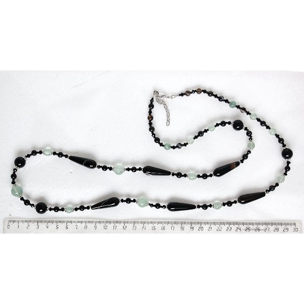 Бусы длинные из агата черного и флюорита, капля 30х10мм шарики 12мм, 8мм, 6мм + хрусталь