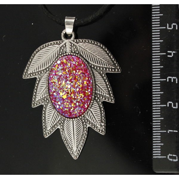 Кулон c кабошоном из пластика "щетка кристаллов", цвет малиновой, "лист", цвет ант. серебро, овал 25х18мм