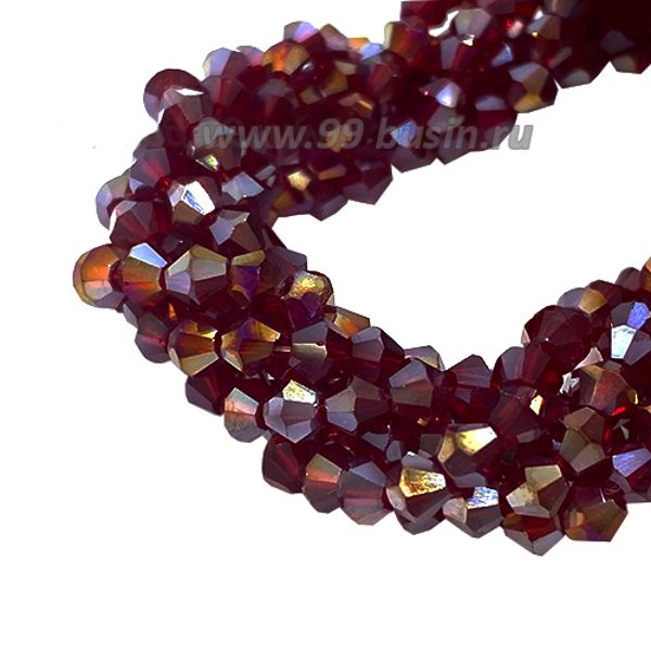 Бусина хрустальная биконус 4 мм, темно-рубиновый/бензин, длина нити около 36 см/95 штук