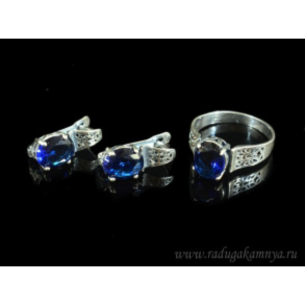 Кольцо и серьги с цирконом искусственным, цвет синий (иск.)
