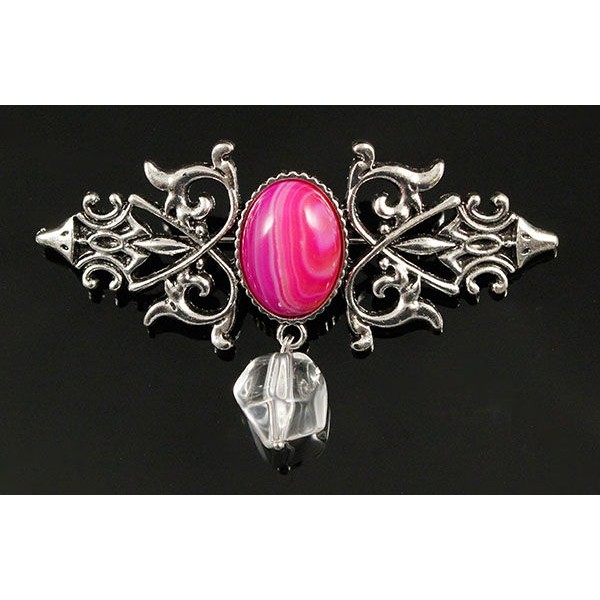 Брошь из агата малинового (тонир.) "вензель", основа 70х2.4мм, овал 18х13мм, подвеска горный хрусталь