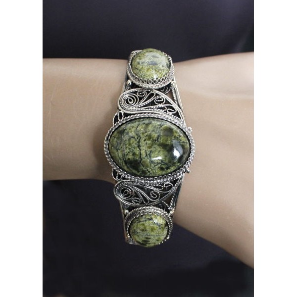 Браслет из змеевика, филигрань, ручная работа, камень овал 25х18мм, овал 18х13мм