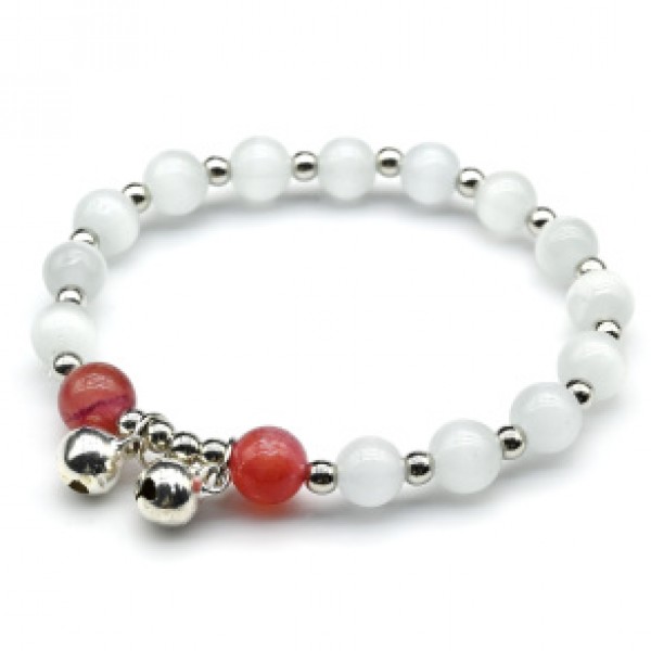 Браслет из кошачьего глаза (синт.) шарик 7,5мм с бубенцами, цвет белый