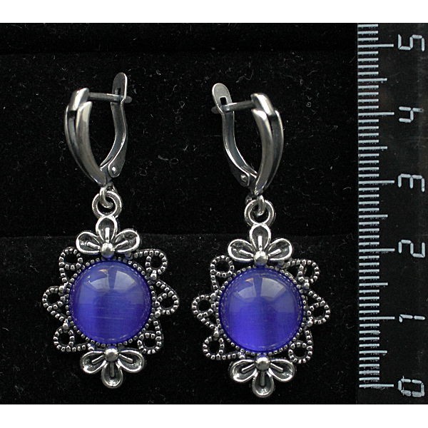 Cерьги из кошачьего глаза (синт.) синего индиго, овал 18х13мм, оправа "трилистник", швензы посеребрение